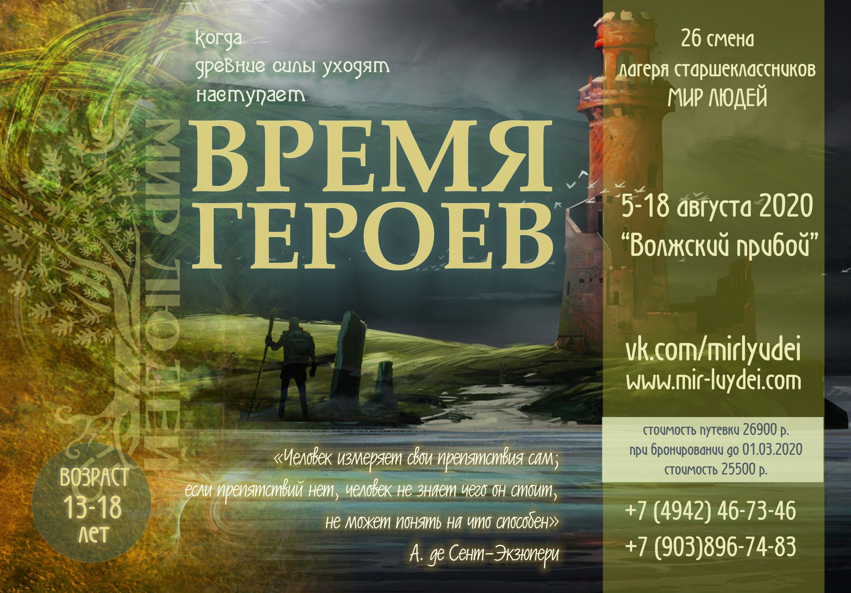 Идет бронирование путевок на летнюю смену "Время Героев" (Мир Людей). Смена пройдет с 5 по 18 августа на базе Волжский прибой. Напоминаем, что до 1.03.2020 открыта система раннего бронирования стоимость путевки 25 500, с 1 марта 2020 стоимость путевки будет 26900.