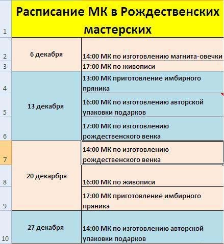 РОЖДЕСТВЕНСКИЕ МАСТЕРСКИЕ декабрь 2014 03 декабря 2014 г. Смотрим расписание мастер-классов в РОЖДЕСТВЕНСКИХ МАСТЕРСКИХ. Записаться и узнать подробности можно по тел. 47-19-89