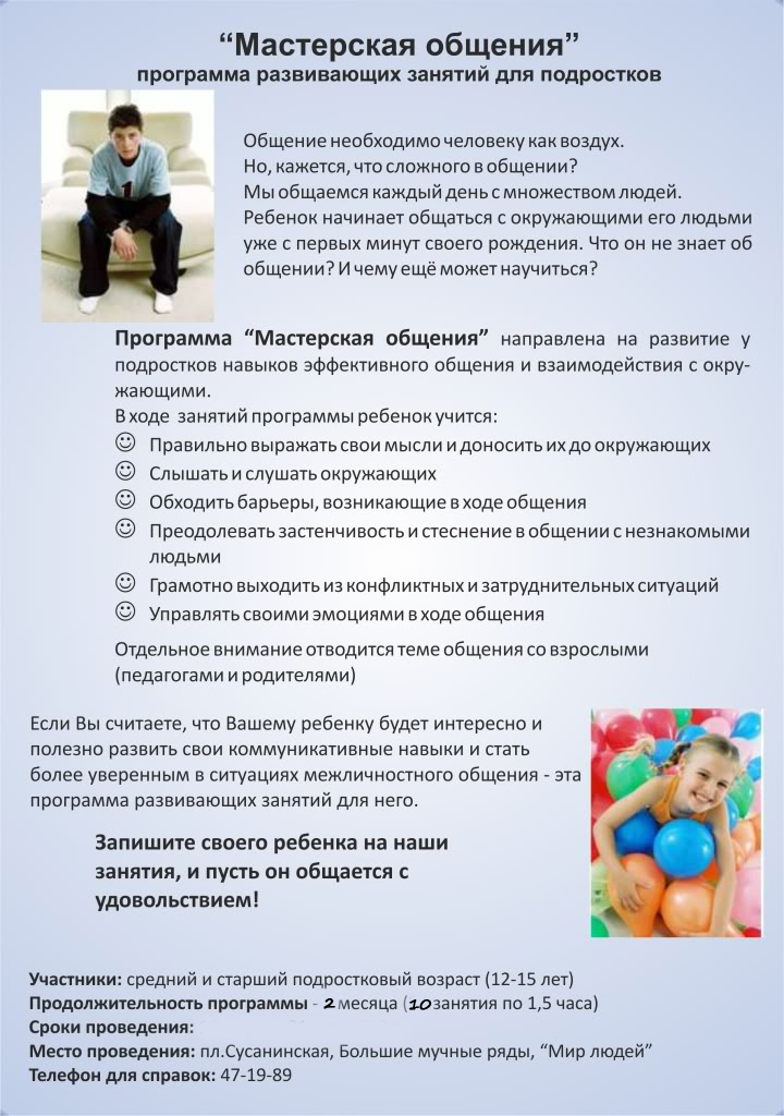 Цель программы: формирование навыков и умений конструктивного общения у подростков.